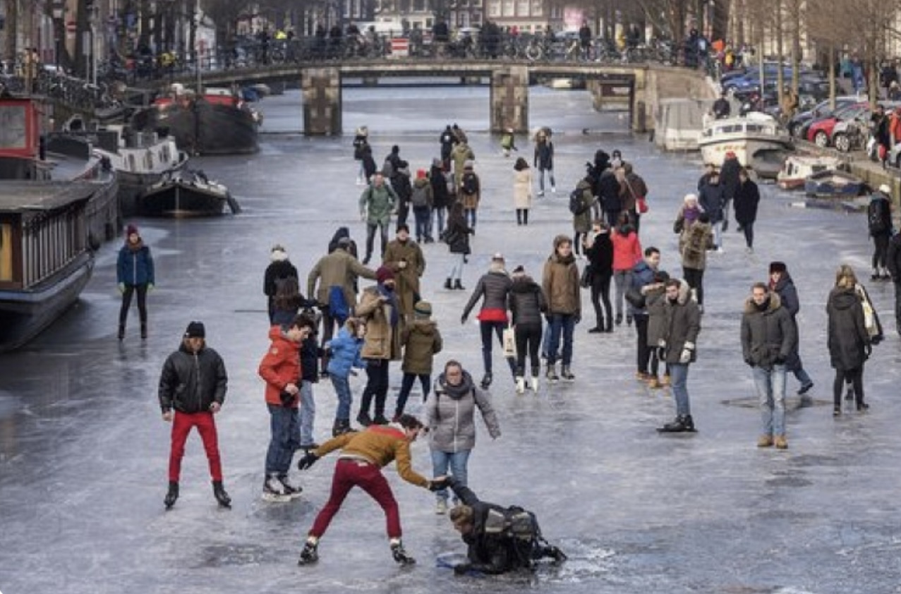 Так получилось, что я никогда там не бывал, хотя часто летал через “Схипхол” – аэропорт, название которому дал старый форт, входивший в свое время в систему оборонительных укреплений города. Один из этих прилётов пришёлся на январское солнечное воскресенье и я увидел сверху, как мне показалось, весь Амстердам, катающийся по каналам на коньках. С тех пор я мечтал оказаться среди этой разноцветной толпы, “обув железом острым ноги”. Гиды (а их было двое в разные дни) слаженно эту мечту разбили, рассказав что из-за глобального потепления Амстел и Эй (реки, сливающиеся как раз здесь, как Арагви и Кура) и 150 каналов не замерзают, точнее замерзают, но раз в семь-восемь лет, да и то так, что народ проваливается под хрупкий лёд. Что, впрочем, никак не отражается на настроении Амстердама. Провалившихся в подавляющем большинстве спасают, веселье продолжается. Два раза в год по рекам и каналам проходят специальные баржи с прикрепленными к днищу магнитами. К этим магнитам “приклеиваются” велосипеды и даже автомобили, случайно или неслучайно упавшие в воду.