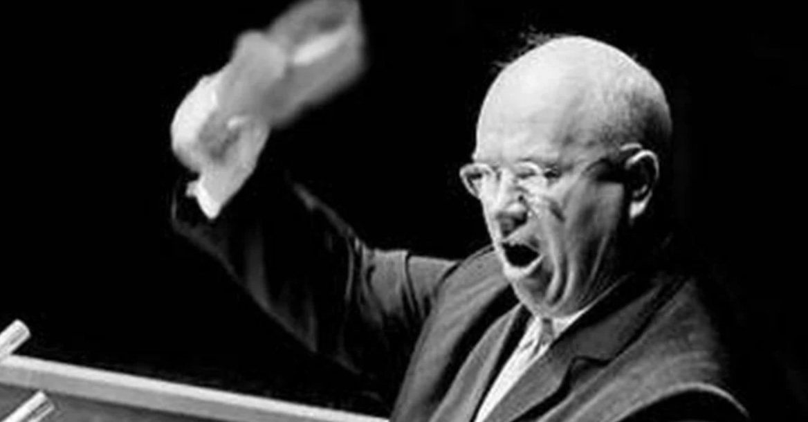 Хрущев прилетел в Нью-Йорк и поехал в Организацию Объединенных Наций. Там он снял туфлю и стал стучать ею по трибуне и закричал: “Мы вам покажем Кузькину мать!”. По крайней мере это то, что нам перевели.